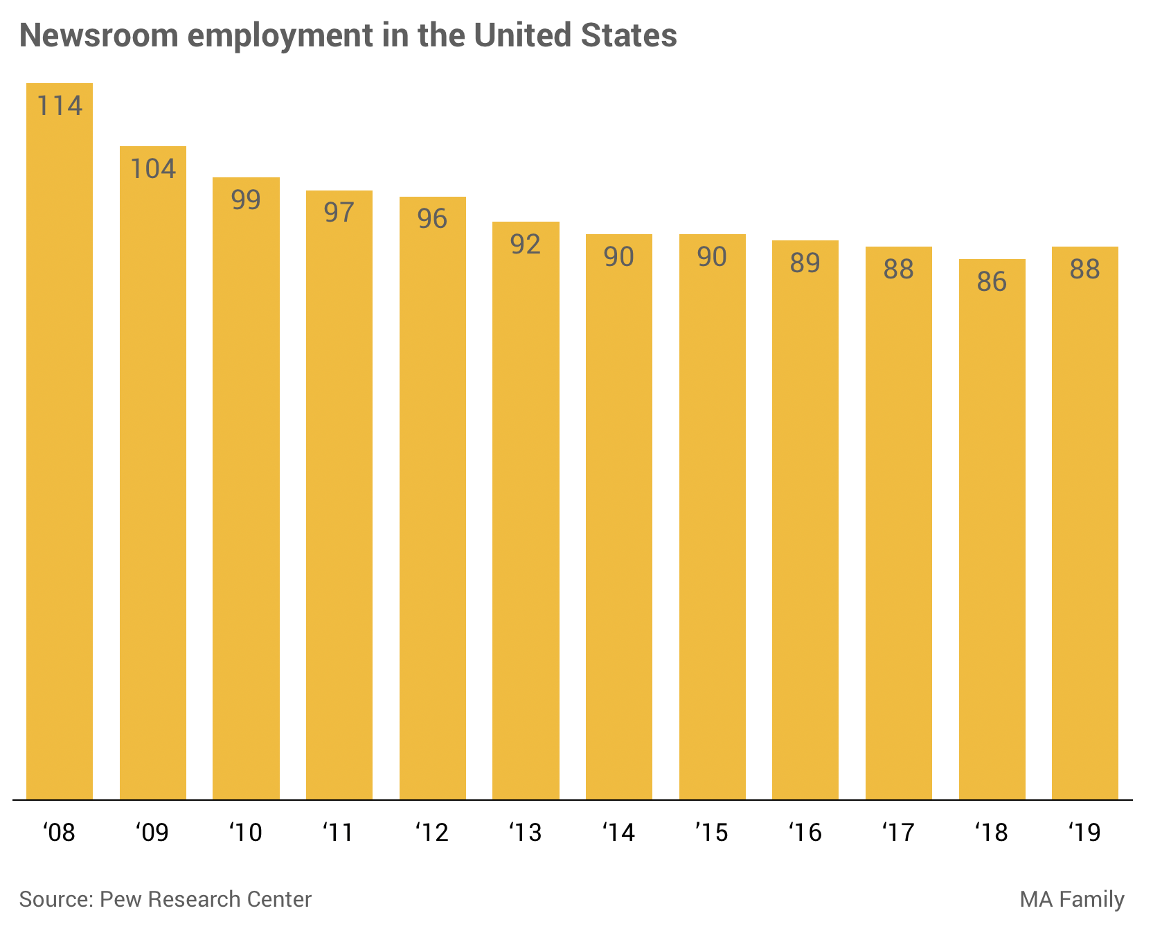 From 2008 to 2019, overall newsroom employment in the U.S. dropped by 23% – a loss of about 27,000 jobs – according to a Pew Research Center analysis of Bureau of Labor Statistics data.