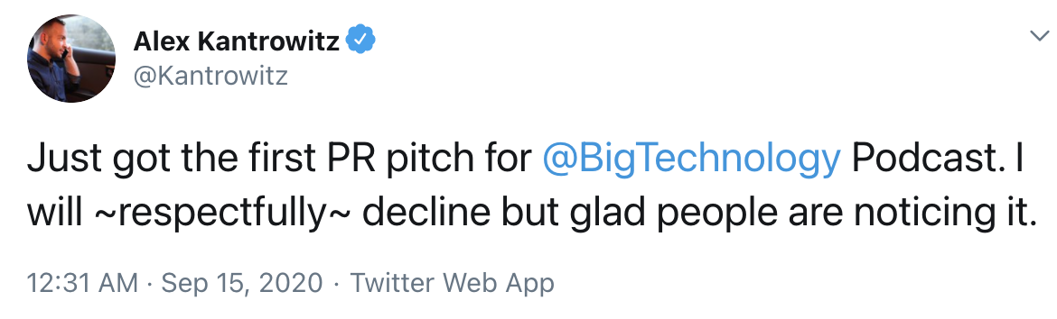 Big Technology will be unafraid, not beholden to narrative, corporate interest, or ideology. It will be personal, a conversation between me and you, the subscribers. It will be consistent, at least one free article per week to start, and a paid option later on. And it will be fun.” – Alex Kantrowitz